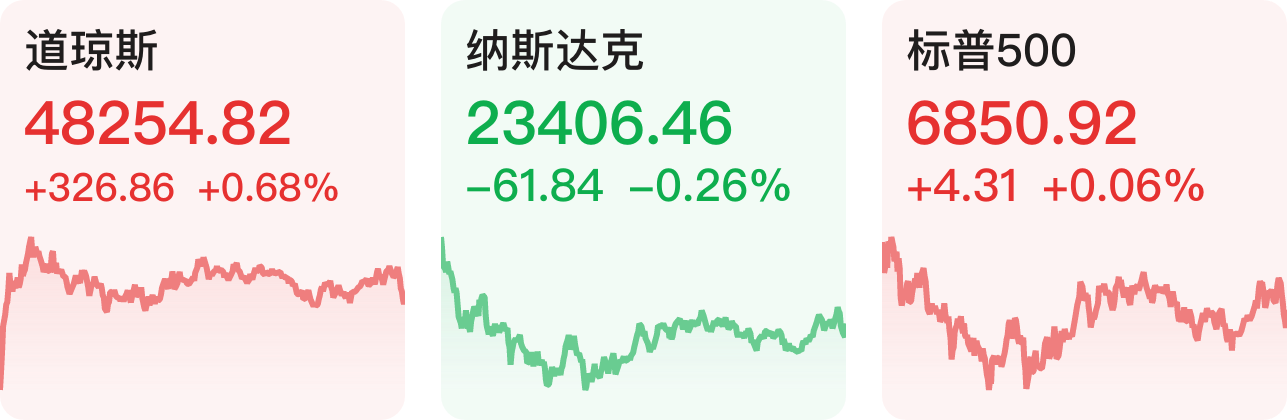 美股三大指数收盘涨跌不一,道指收涨0.68%,纳指跌0.26%,标普500指数涨0.06%。AMD涨9%,甲骨文跌超3%,特斯拉跌超2%。热门中概股多数下跌,纳斯达克中国金龙指数收跌1.46%。小鹏汽车、蔚来、爱奇艺、百度跌超2%。
