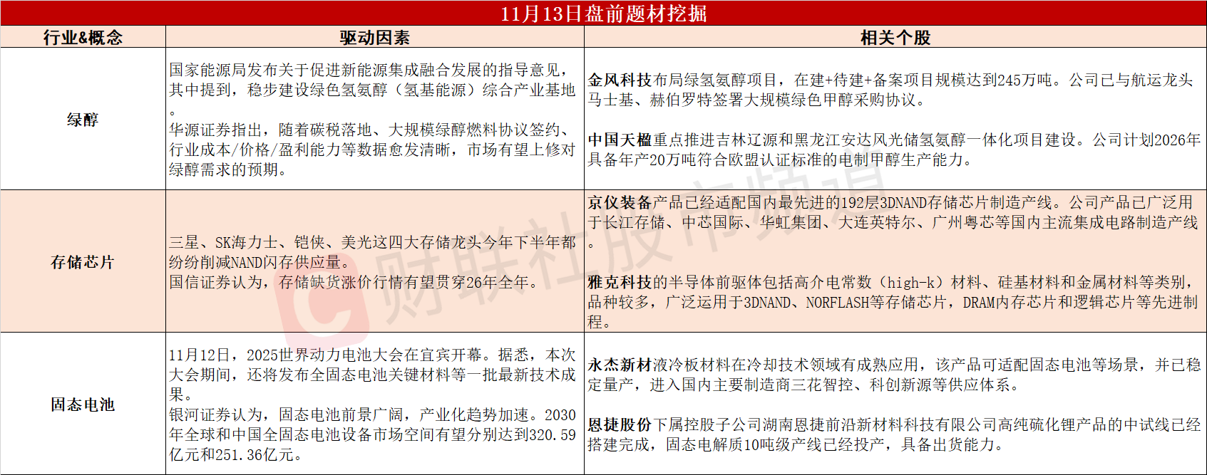 ①国家能源局推动绿色氢氨醇产业基地建设,绿醇行业有望迎来预期修复。②存储龙头计划提高NAND价格并削减产量,存储涨价行情有望贯穿26年全年。③量产时间计划表逐步清晰,机构称固态电池产业化节奏提速。