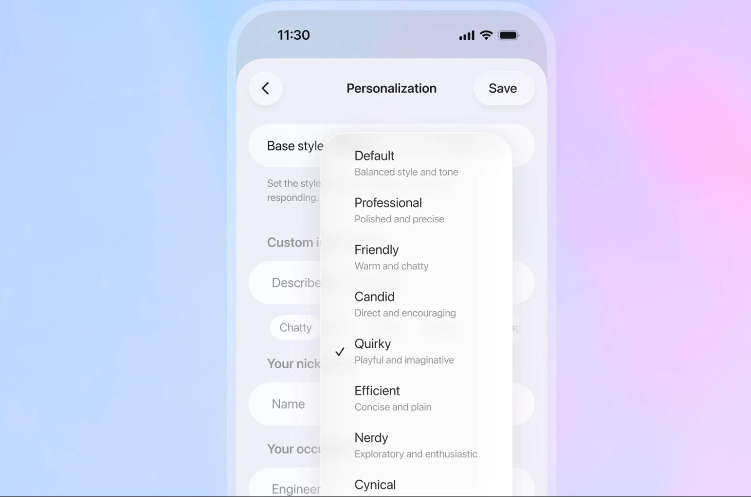 GPT-5.1的另一大亮点是个性化定制功能的全面升级。OpenAI推出了八大对话风格矩阵,在优化 “默认”“友好”“高效” 三种经典风格基础上,新增 “专业”“直言不讳”“古怪” 三类选项,叠加保留的 “愤世嫉俗”“书呆子气” 风格,覆盖工作、社交、创作等多元场景。针对进阶用户,平台还测试精细化调节功能,支持自定义回答简洁度、语气温暖度、易读性及emoji使用频率,更具备智能感知能力。当模型捕捉到用户对话中的风格偏好时,会主动建议更新设置,实现 “无需手动即可个性化”。所有设置调整实时生效。