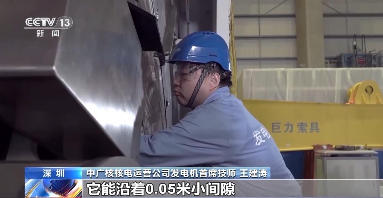 中广核核电运营公司发电机首席技师王建涛:发电机抽转子检修是发电机检修中风险最高、工期最长、投入人员最多的工作,要花三四十人连续工作十几个小时,稍微一碰撞造成的经济损失达几亿。小小的机器人可以像孙悟空变成小人一样,它能沿着0.05米小间隙进入发电机完成各种检修和实验,节约大量的检修时间,5个人把工作干完,节约大量的人力。