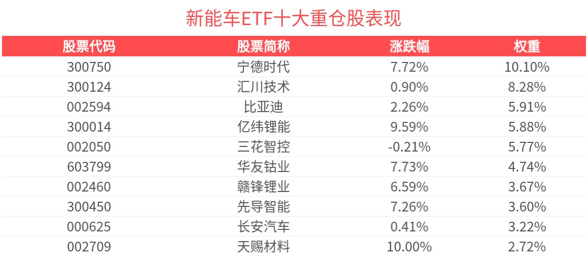 数据显示,截至2025年10月31日,中证新能源汽车产业指数(930997)前十大权重股分别为宁德时代(300750)、汇川技术(300124)、三花智控(002050)、比亚迪(002594)、亿纬锂能(300014)、华友钴业(603799)、赣锋锂业(002460)、先导智能(300450)、长安汽车(000625)、天齐锂业(002466),前十大权重股合计占比53.56%。
