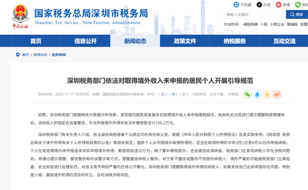 国家税务总局深圳市税务局近日发布通知称,前期,深圳税务部门根据税收大数据分析线索,发现境内居民周某某存在取得境外收入未申报缴税疑点,税务机关对其进行提示提醒和政策辅导后,该纳税人积极配合自查整改,补充申报境外所得并依法补缴税款合计336.2万元。