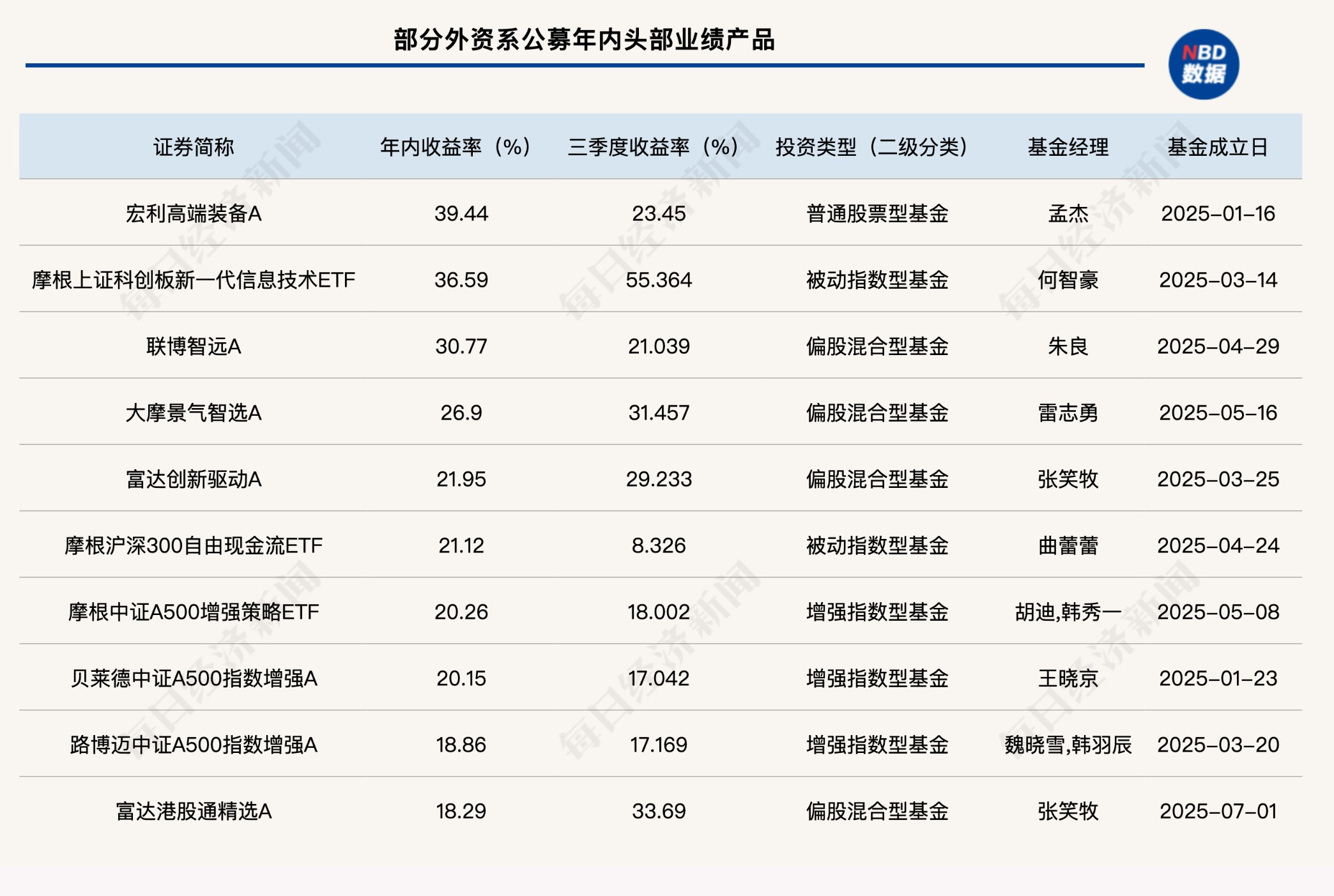 《每日经济新闻》记者还注意到,2025年以来外资公募的新品布局也在提速。Wind统计显示,今年以来,前述9家外资公募共成立了90只新基金(统计所有份额),占所有基金数量的16.45%。其中,权益类基金(统计偏股混合型、QDII股票型、指数增强型、普通股票型、灵活配置型、被动指数型基金)的数量共有41只,摩根基金、宏利基金等机构在今年成立的新基金数量居前。