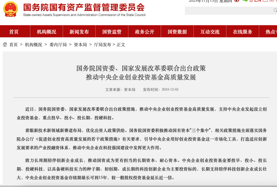 上述央企创投基金成立的政策背景是,国资委提出,到2025年央企在战新产业收入占比要达到35%。2024年12月,国务院国资委、国家发展改革委联合出台政策措施,推动中央企业创业投资基金高质量发展,支持中央企业发起设立创业投资基金,重点投早、投小、投长期、投硬科技。