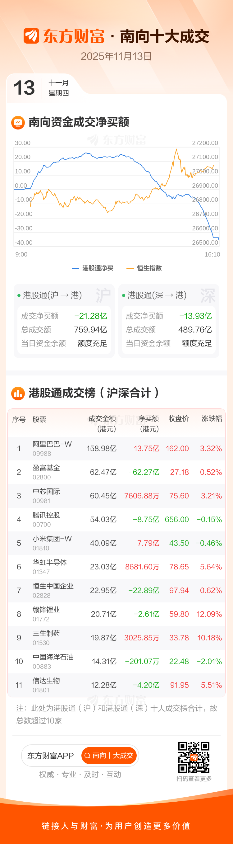 11月13日南向资金净卖逾35亿港元,逾13亿抢筹阿里巴巴-W