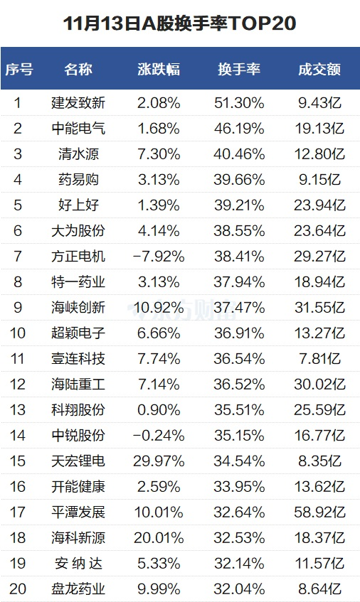 当天换手率最高的个股为建发致新,全天换手率51.3%。中能电气紧随其后,全天换手率46.19%。