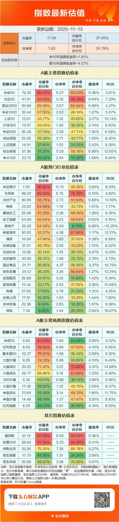截至11月13日收盘,东方财富Choice数据显示,东财全A市盈率为17.56倍,市盈率百分位为37.49%;市净率为1.83倍,市净率百分位为24.79%。