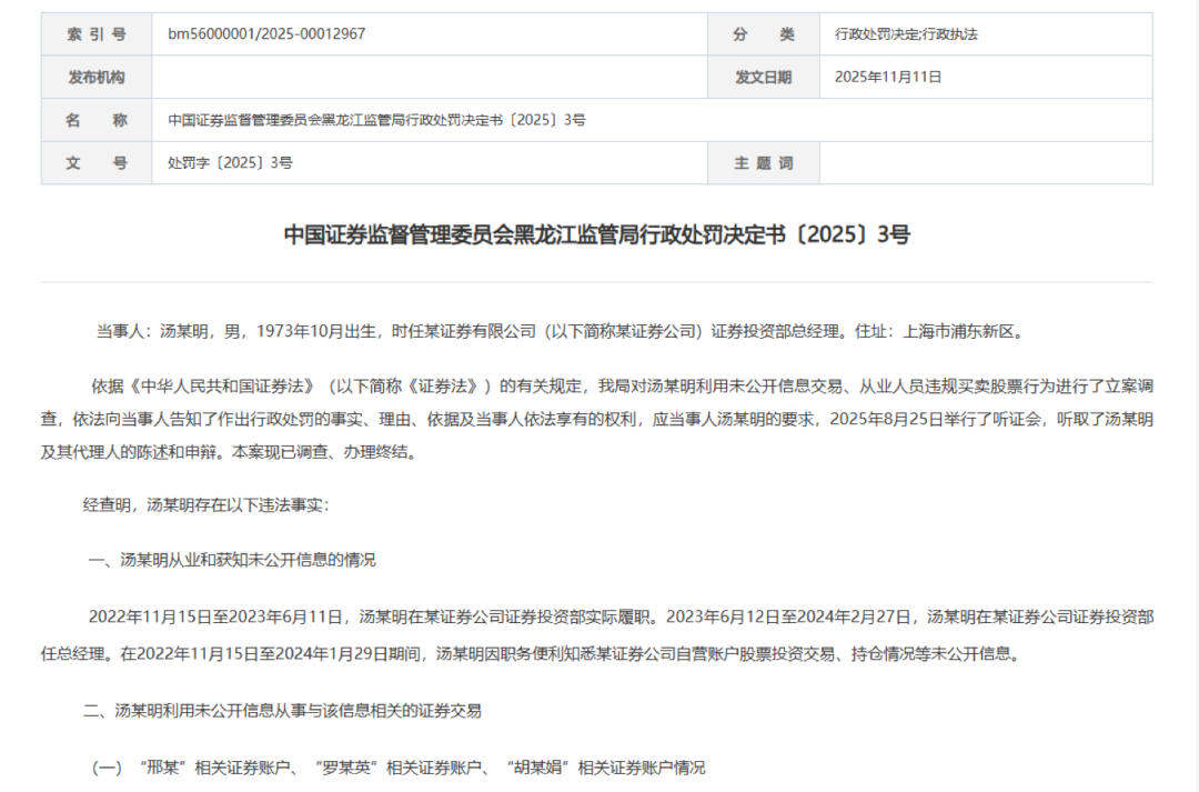 黑龙江证监局披露的行政处罚决定书显示,汤某明在2022年11月15日至2024年1月29日期间,先后在某证券公司证券投资部实际履职并担任总经理,利用职务便利获取公司自营账户的股票交易及持仓等未公开信息。
