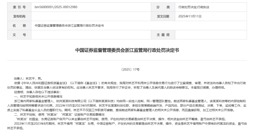 同日,浙江证监局也公布一则“老鼠仓”行政处罚决定。2022年10月至2023年9月,林艺平在某某科技公司承担交易策略开发与产品风控等工作,实质上实施了私募基金从业人员职责。