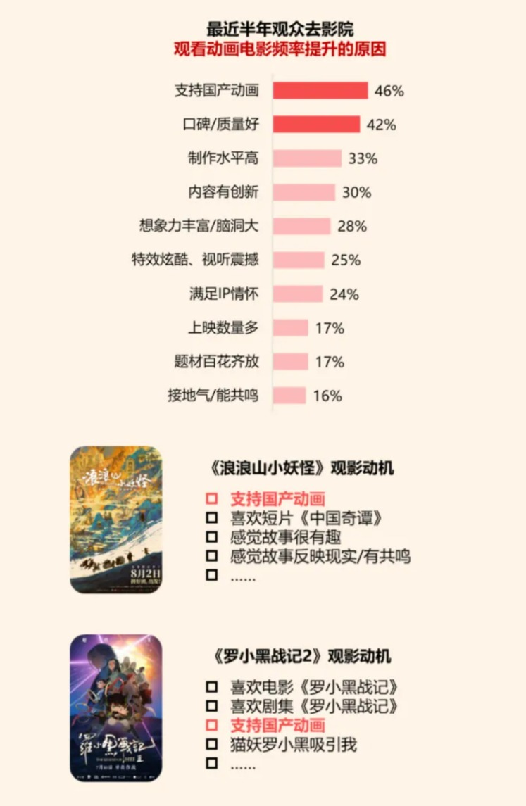 类型表现方面,动画电影表现突出,上映总数量略高于去年同期。灯塔研究院线上调研显示,《哪吒之魔童闹海》的火热不仅提升了观众对动画电影的偏好程度,其引发的观影热情更持续外溢至其他影片。调研数据显示,超四成观众表示受该片影响,对其它电影信息的关注度也有所增加。近半数观众坦言,在过去半年,“支持国产动画”是其走进影院的重要动因之一。