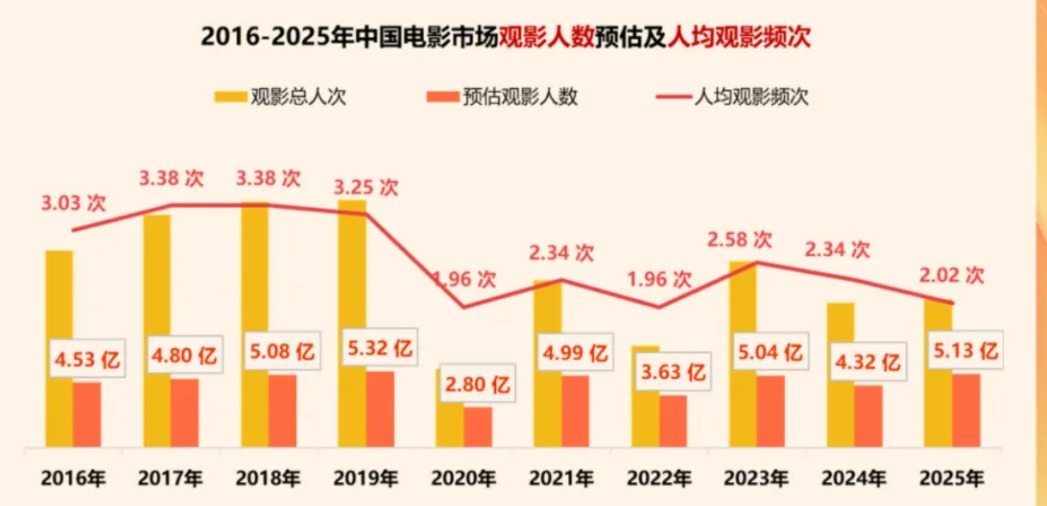灯塔研究院院长牧晨表示,2025年中国电影市场呈现稳中有进的增长态势,观影人数再创近年新高;与此同时,人均观影频次的回落却如一面镜子,映照出观众观影决策的愈发审慎。