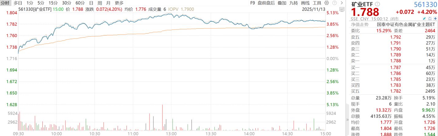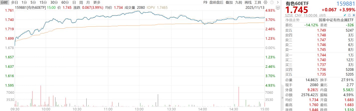 金融属性和商品属性共振,有色金属板块有望多点开花。投资者可以关注聚焦拥有有色金属矿产资源的矿业ETF(561330)和工业金属、贵金属、能源金属与小金属全覆盖的有色60ETF(159881)。从行业分布看,矿业ETF和有色60ETF中的黄金、铜、铝、锂累计占比均超过60%。(数据来源:Wind,截至2025/11/12。行业分布按照申万三级行业分布计算。)感兴趣的投资者可以保持跟踪,把握有色板块中长期的投资价值。