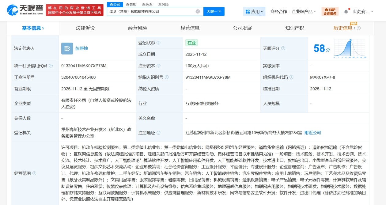 每经AI快讯,天眼查工商信息显示,近日,造父(常州)智能科技有限公司成立,法定代表人为彭照坤,注册资本100万元人民币,经营范围含机动车检验检测服务、网络预约出租汽车经营服务、道路货物运输、互联网信息服务、人工智能理论与算法软件开发、人工智能应用软件开发、二手车经纪等。股东信息显示,该公司由造父智能旗下广州造父智能科技有限公司全资持股。