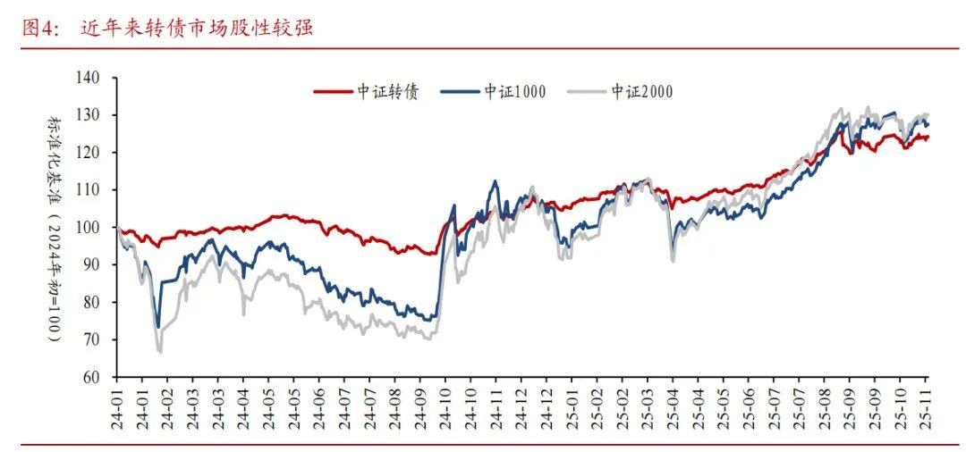 近年来,可转债市场的定价逻辑正逐步从“债券属性主导”向“权益属性强化”转变。在资金结构中,固收+、二级债基及量化中性资金的持续入场,使市场博弈更趋频繁;在估值层面,高价转债占比和转股溢价率中枢高企,债底保护显著减弱。这一系列变化共同推动了转债市场的股性强化与风格偏移。
