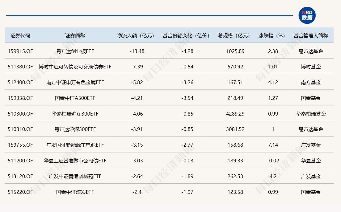 与此同时,易方达创业板ETF基金份额减少4.28亿份,净流出额为13.48亿元;博时中证可转债及可交换债券ETF基金份额减少0.54亿份,净流出额为7.39亿元;南方中证申万有色金属ETF基金份额减少3.26亿份,净流出额为5.82亿元。