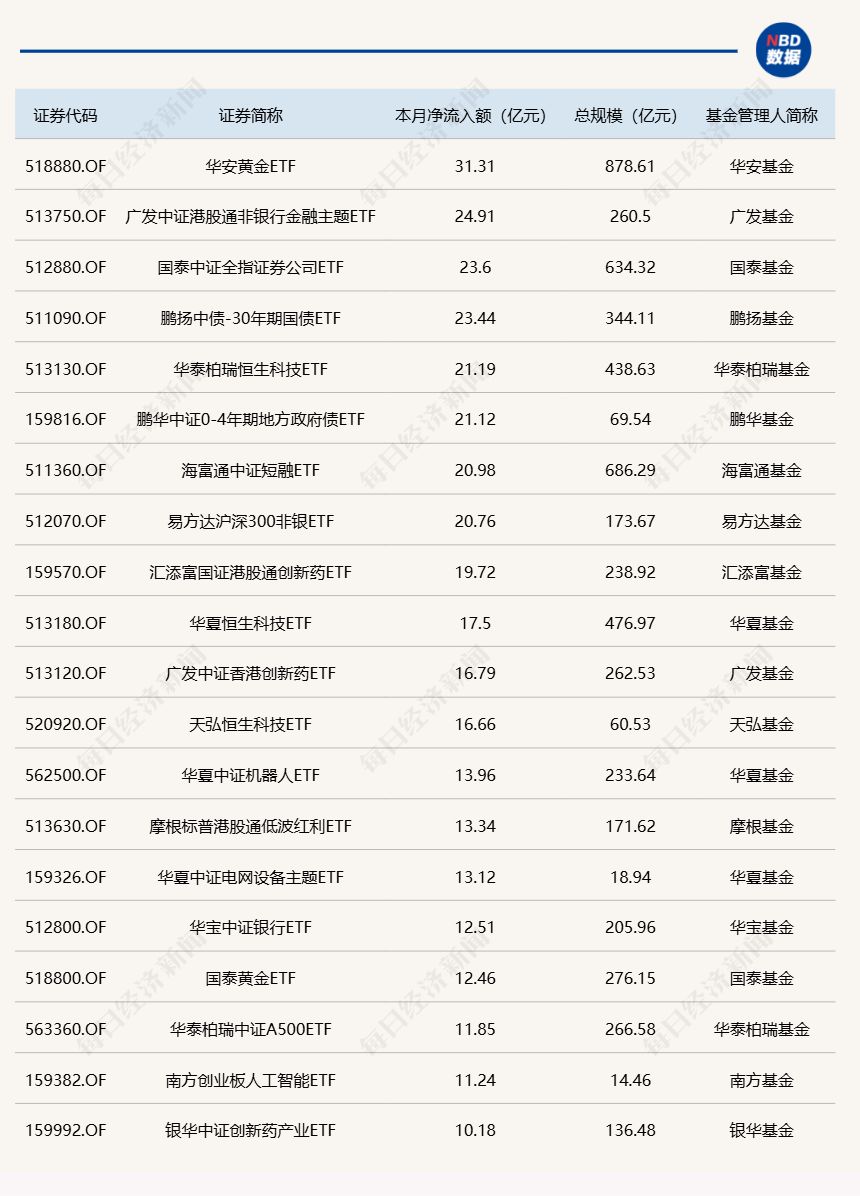 截至11月13日,本月资金净流入额居前20的ETF名单如下: