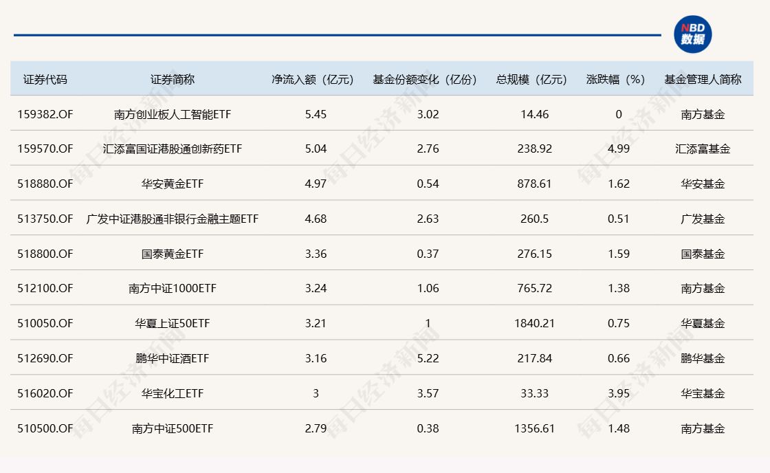 Wind数据显示,在11月13日的非货币ETF市场中,南方创业板人工智能ETF基金份额增加3.02亿份,净流入额为5.45亿元;汇添富国证港股通创新药ETF基金份额增加2.76亿份,净流入额为5.04亿元;华安黄金ETF基金份额增加0.54亿份,净流入额为4.97亿元。