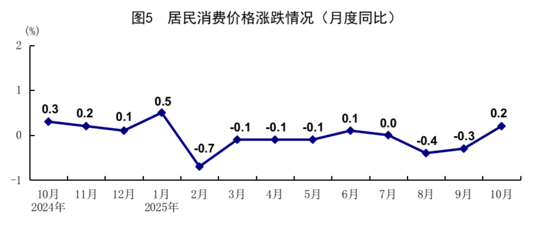 10月份,全国居民消费价格(CPI)同比上涨0.2%,上月为下降0.3%;环比上涨0.2%。分类别看,食品烟酒价格同比下降1.6%,衣着价格上涨1.7%,居住价格上涨0.1%,生活用品及服务价格上涨1.9%,交通通信价格下降1.5%,教育文化娱乐价格上涨0.9%,医疗保健价格上涨1.4%,其他用品及服务价格上涨12.8%。在食品烟酒价格中,猪肉价格下降16.0%,鲜菜价格下降7.3%,鲜果价格下降2.0%,粮食价格下降0.7%。扣除食品和能源价格后的核心CPI同比上涨1.2%,涨幅比上月扩大0.2个百分点。1-10月份,全国居民消费价格同比下降0.1%。