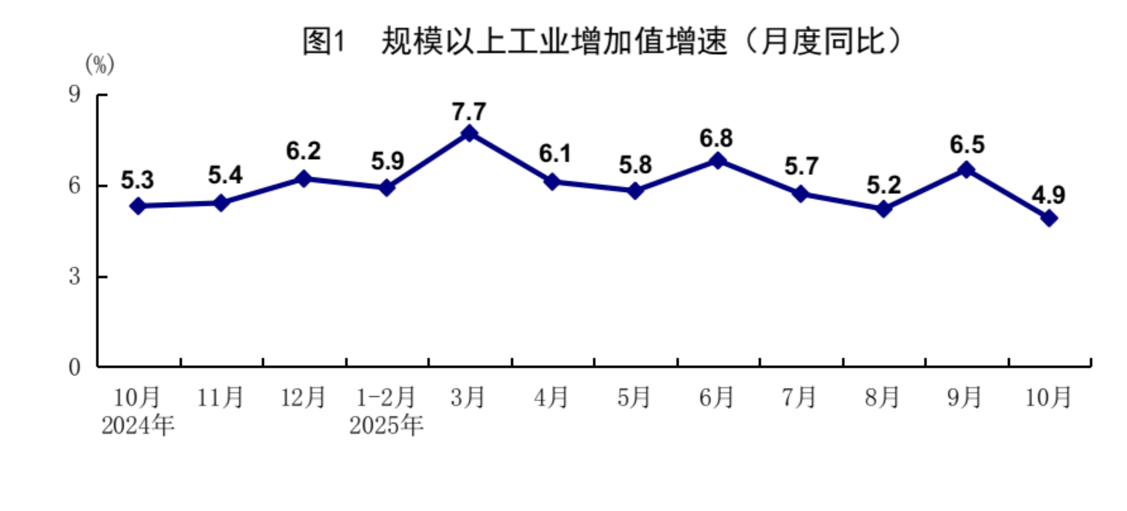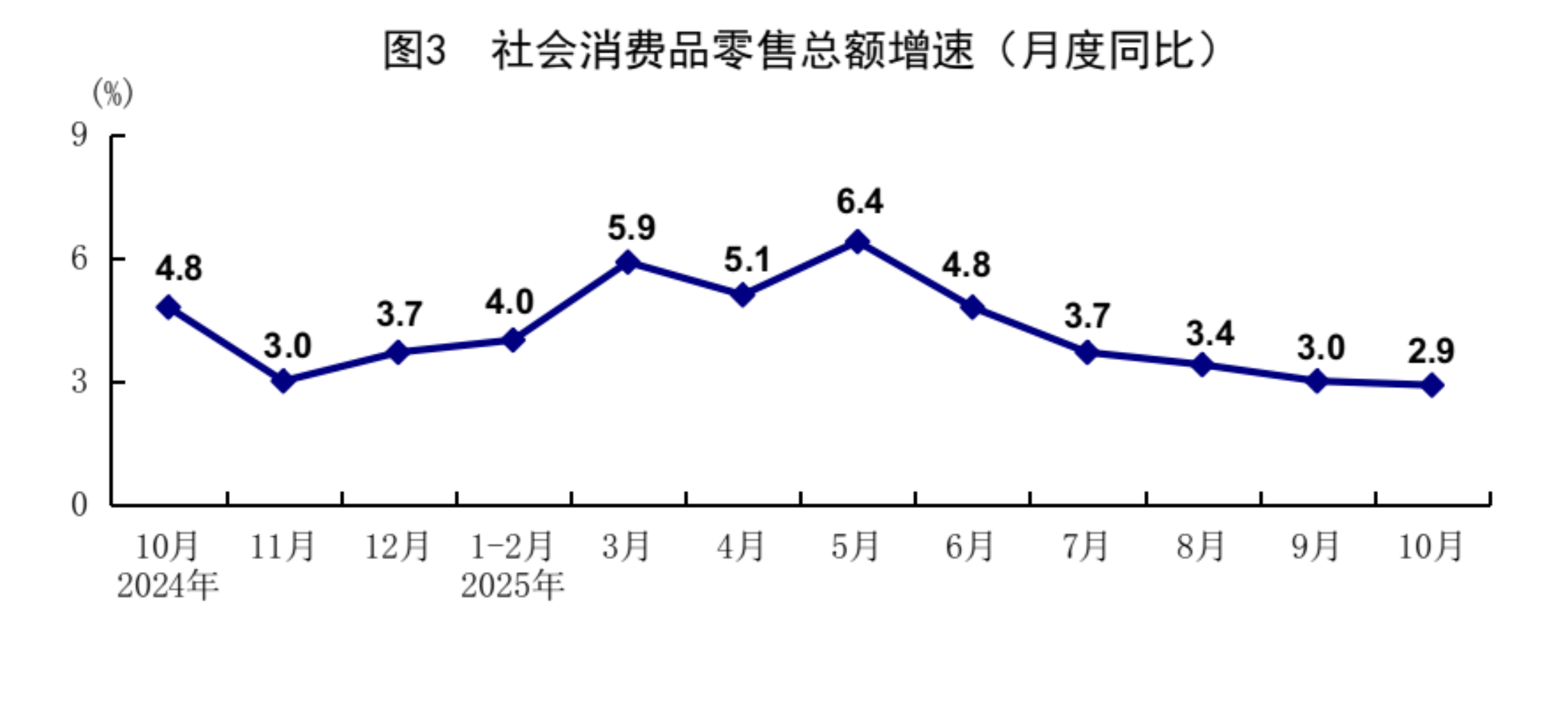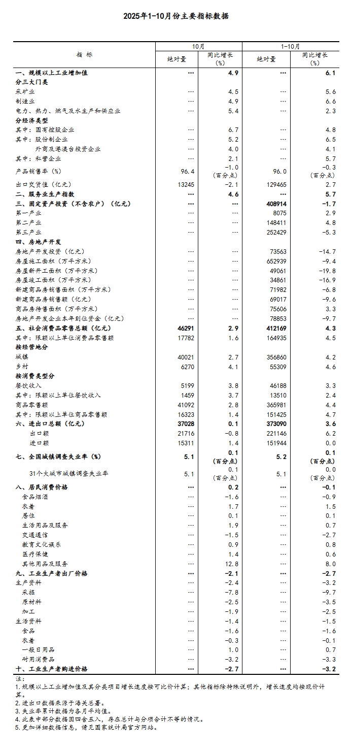 国家统计局:10月规模以上工业增加值增长4.9% 社会消费品零售总额增长2.9%