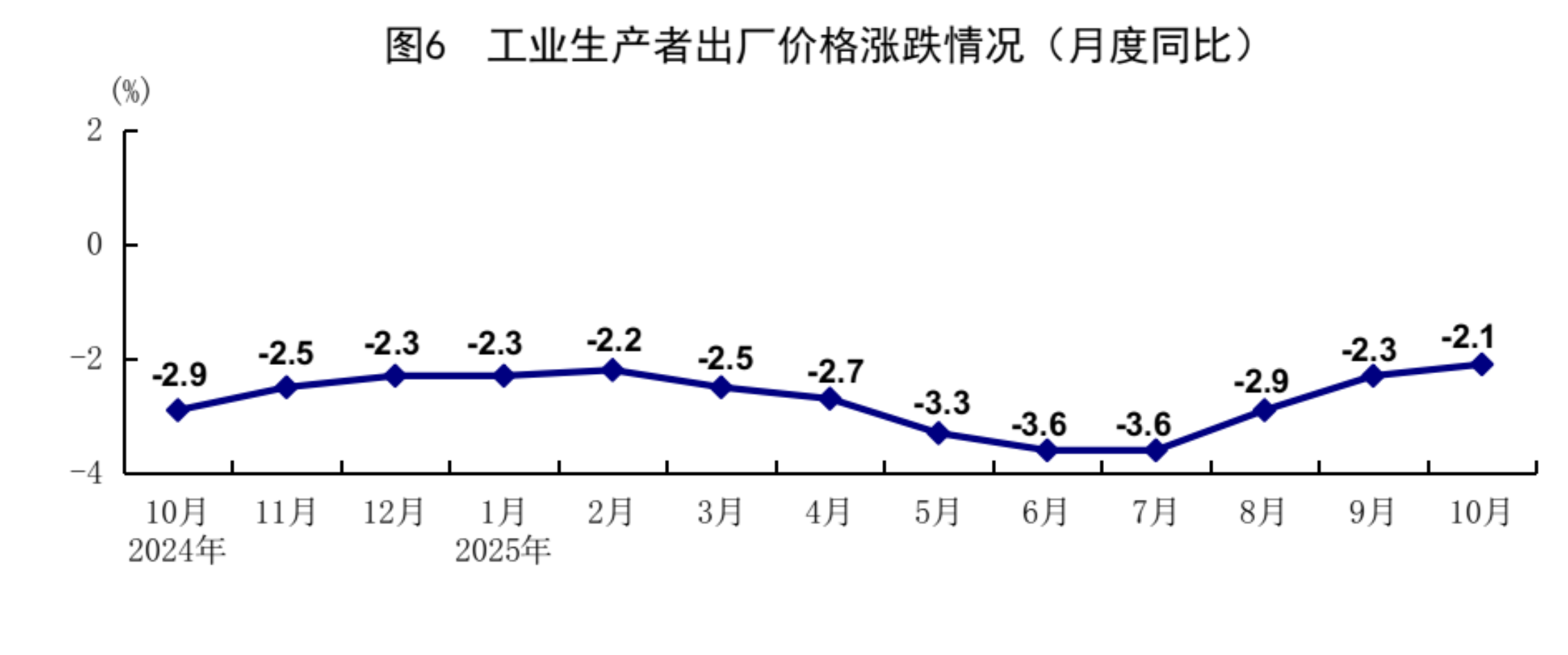 10月份,全国工业生产者出厂价格同比下降2.1%,降幅比上月收窄0.2个百分点,环比上涨0.1%;全国工业生产者购进价格同比下降2.7%,降幅收窄0.4个百分点,环比上涨0.1%。1-10月份,全国工业生产者出厂价格和购进价格同比分别下降2.7%、3.2%。