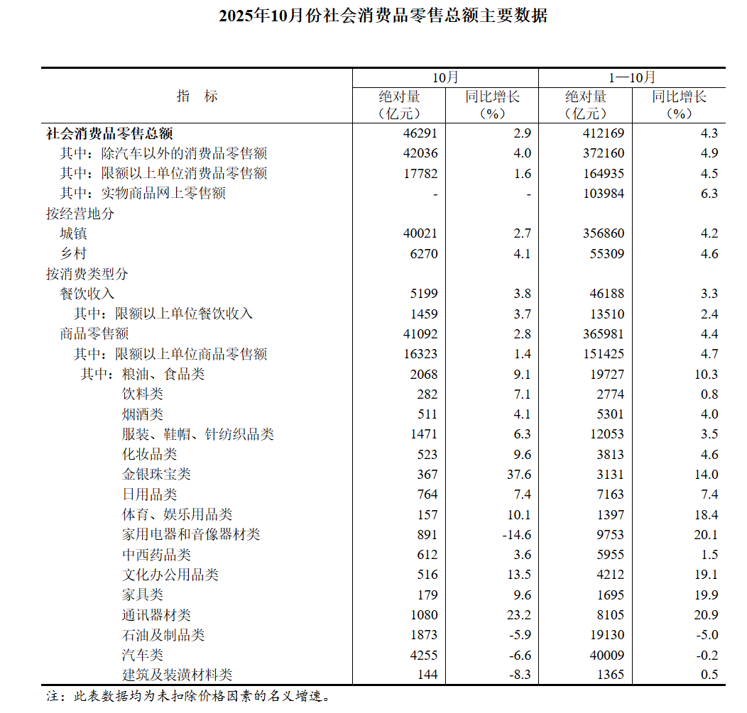 国家统计局:10月份社会消费品零售总额46291亿元 同比增长2.9%