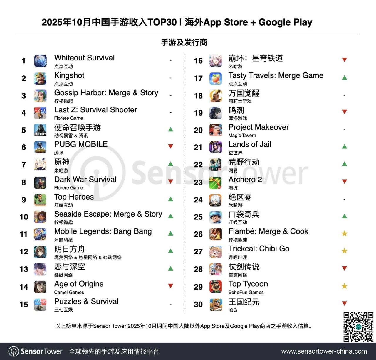 Sensor Tower商店情报平台最新数据显示,在10月出海手游收入榜中,《Whiteout Survival》和《Kingshot》持续包揽冠亚军,《Tasty Travels: Merge Game》收入再度提升15%,排名升至榜单第17名。