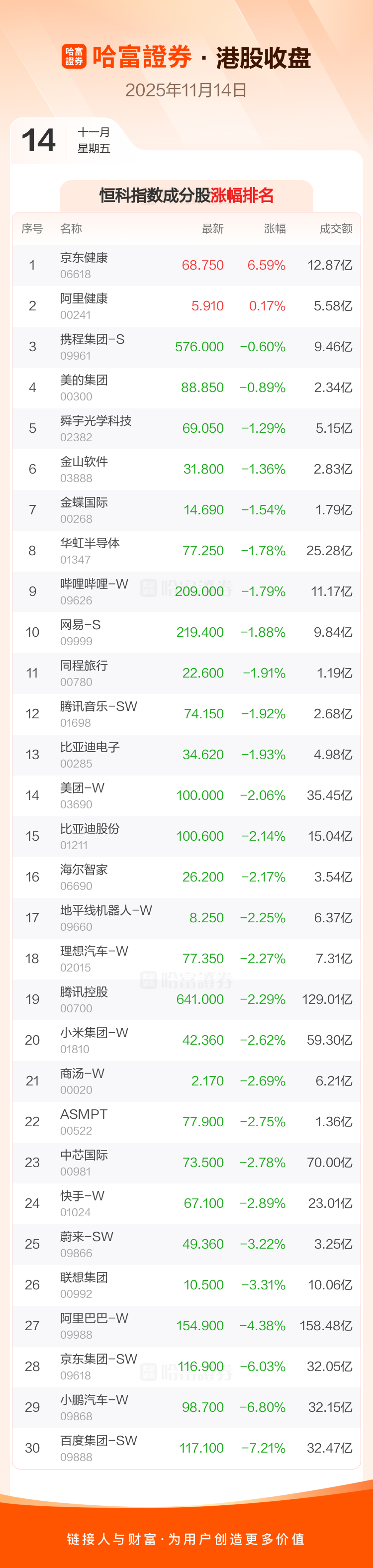港股收盘:恒指跌1.85% 百度集团-SW领跌成分股