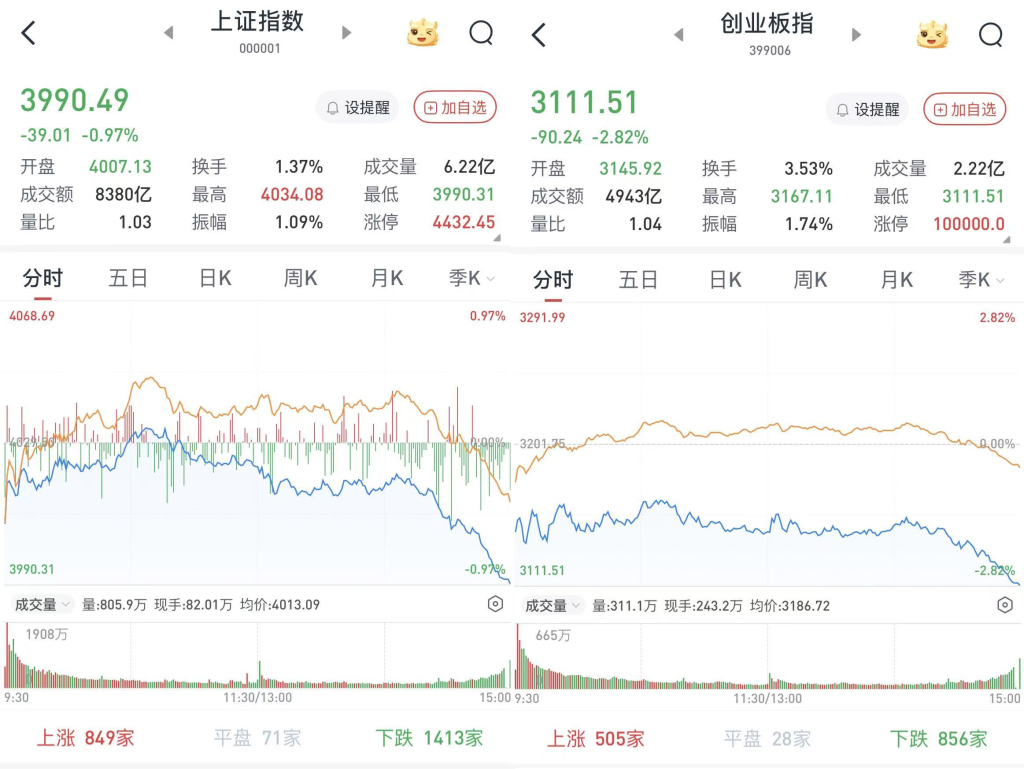 至收盘,上证综指跌0.97%,报3990.49点;科创50指数跌2.72%,报1361.23点;深证成指跌1.93%,报13216.03点;创业板指跌2.82%,报3111.51点。