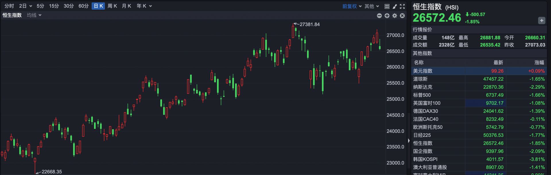 截至收盘,恒指报收于26572.46点,下跌500.57点,跌幅1.85%。