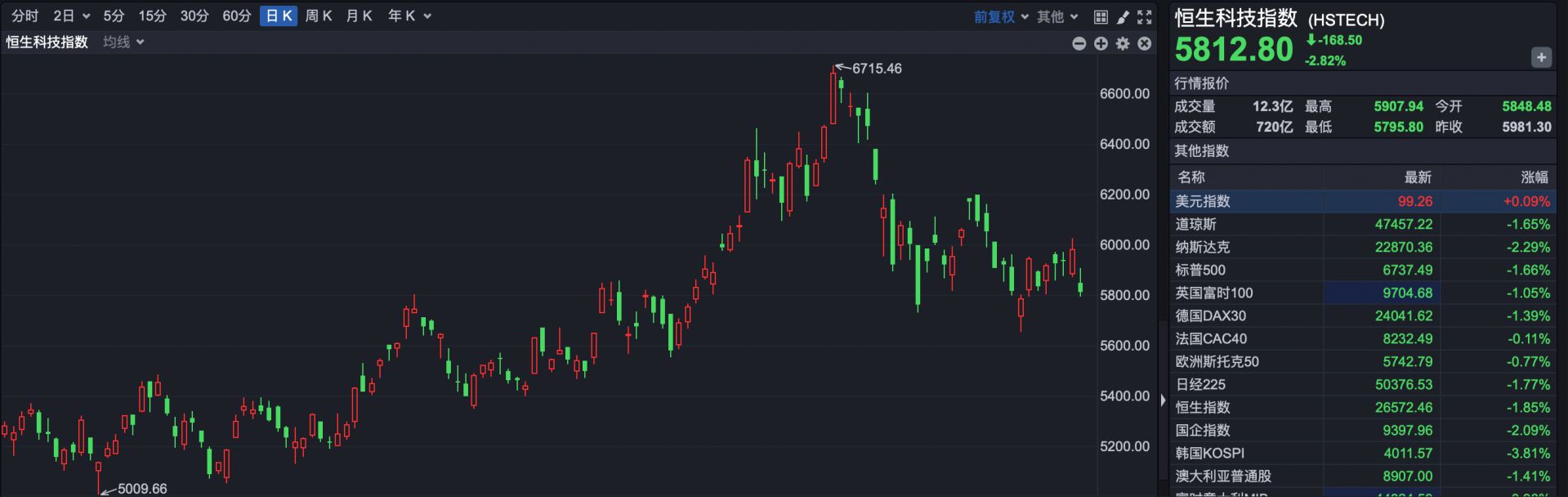 恒生科技指数报收于5812.80点,下跌168.50点,跌幅2.82%。