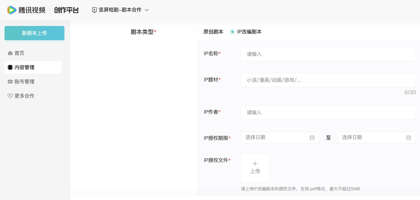 腾讯视频竖屏短剧剧本合作开放平台,IP改编剧本需提交授权文件。(图源:平台截图)