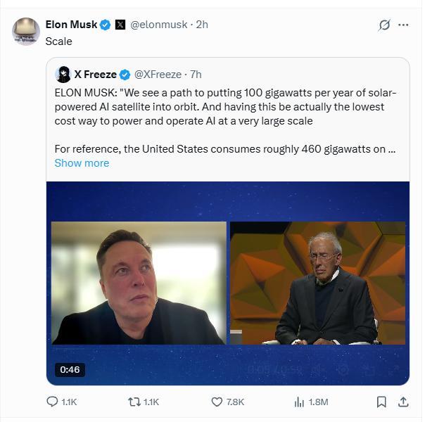 日前,马斯克在X上转发了一位网友分享的他最近接受罗恩·巴伦采访的视频。马斯克在采访中说:“我们看到了一条可行的路径,能够每年将100吉瓦的太阳能驱动的人工智能卫星送入轨道。而且这种方式实际上能够以最低的成本大规模驱动并运行人工智能。”