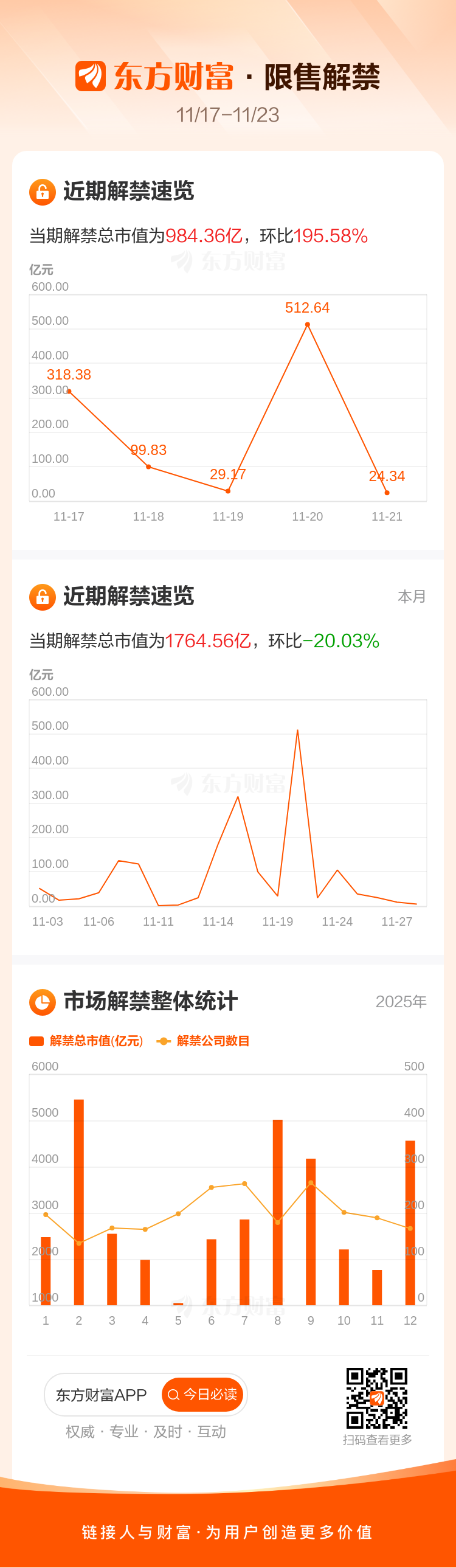 下周(11月17日至11月23日)有60家公司限售股陆续解禁,当期解禁总市值为984.36亿元,环比195.58%。