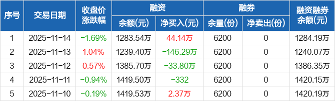 A50ETF:融资净买入44.14万元,融资余额1283.54万元(11-14)
