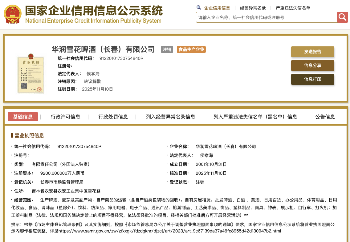 国家企业信用信息公示系统网站显示,11月10日,华润雪花啤酒(长春)有限公司登记状态由存续变更为注销,注销原因为决议解散。