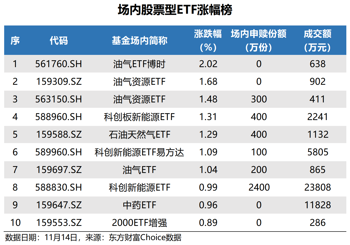 数据显示,上周五场内股票型ETF中,油气ETF博时、油气资源ETF(159309.SZ)、油气资源ETF(563150.SH)涨幅居前。其中,油气ETF博时涨幅最大,为2.02%。