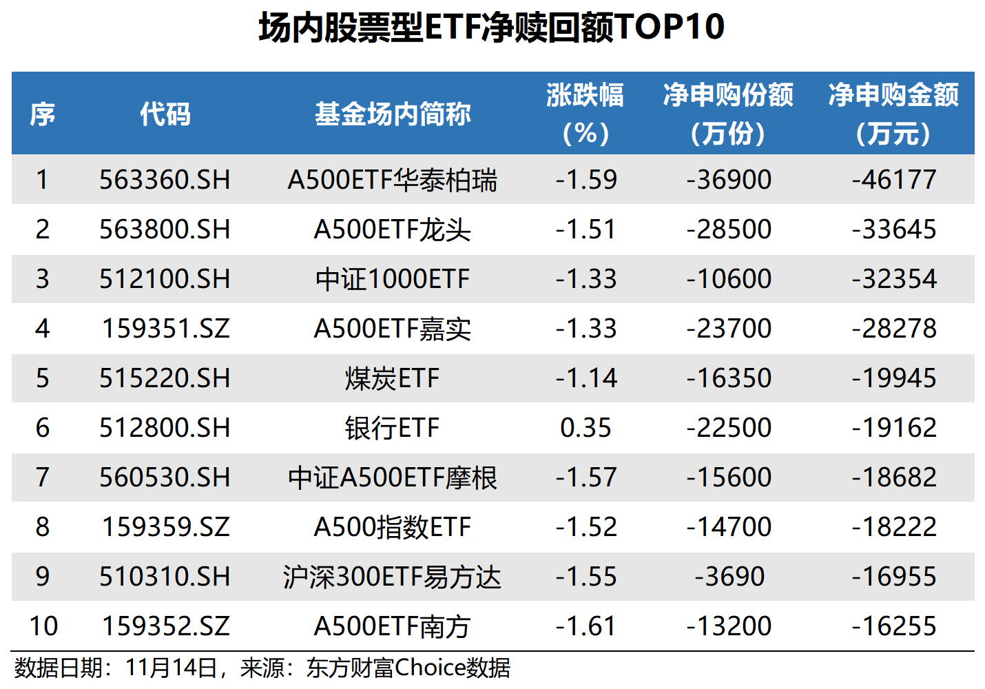 数据还显示,上周五净赎回金额最多的场内股票型ETF为A500ETF华泰柏瑞,净赎回金额4.62亿元;A500ETF龙头紧随其后,净赎回金额3.36亿元。