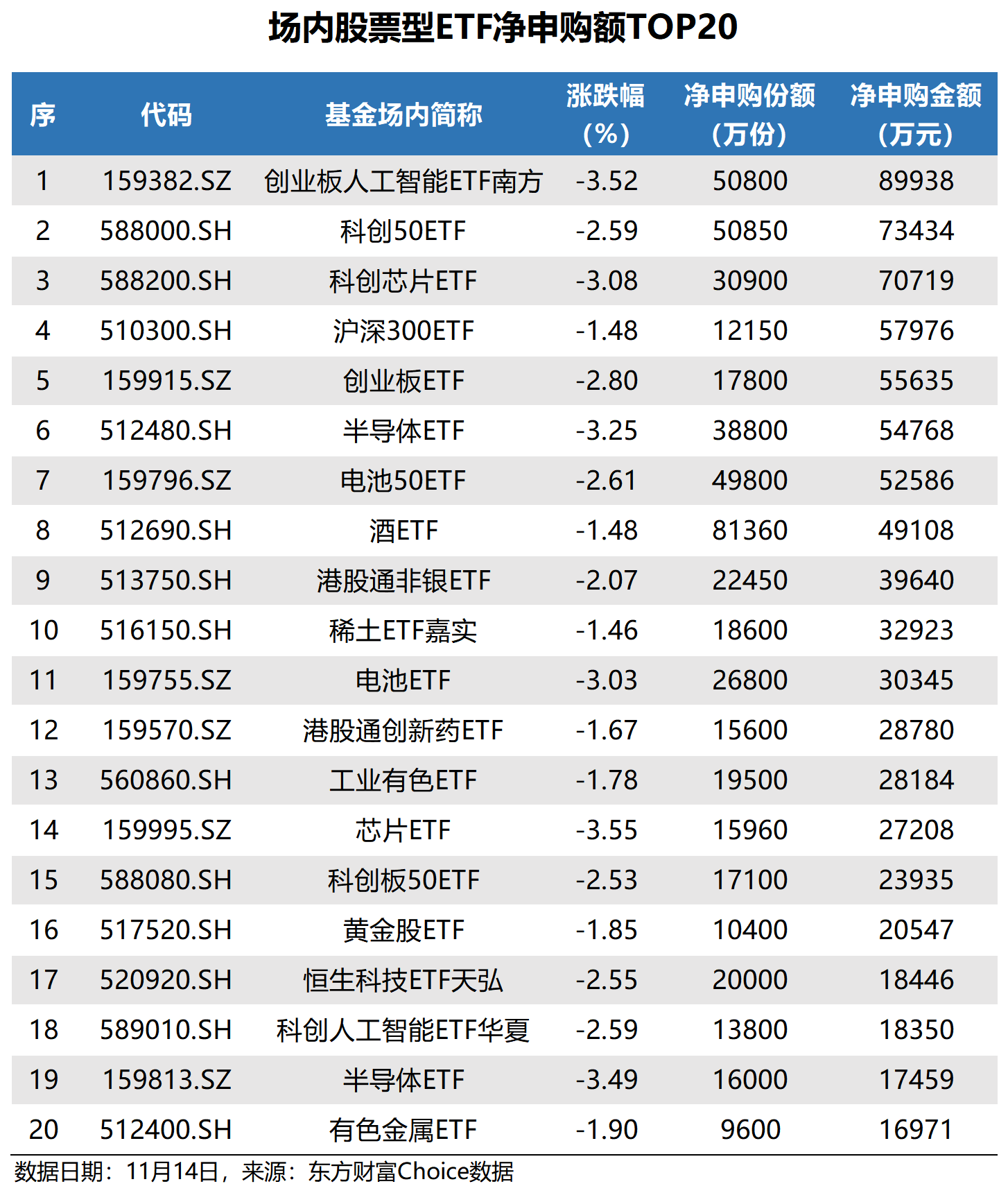 上周五,净申购金额最多的为创业板人工智能ETF南方,净申购金额为8.99亿元。此外,科创50ETF和科创芯片ETF也获购居前,净申购金额依次为7.34亿元和7.07亿元。