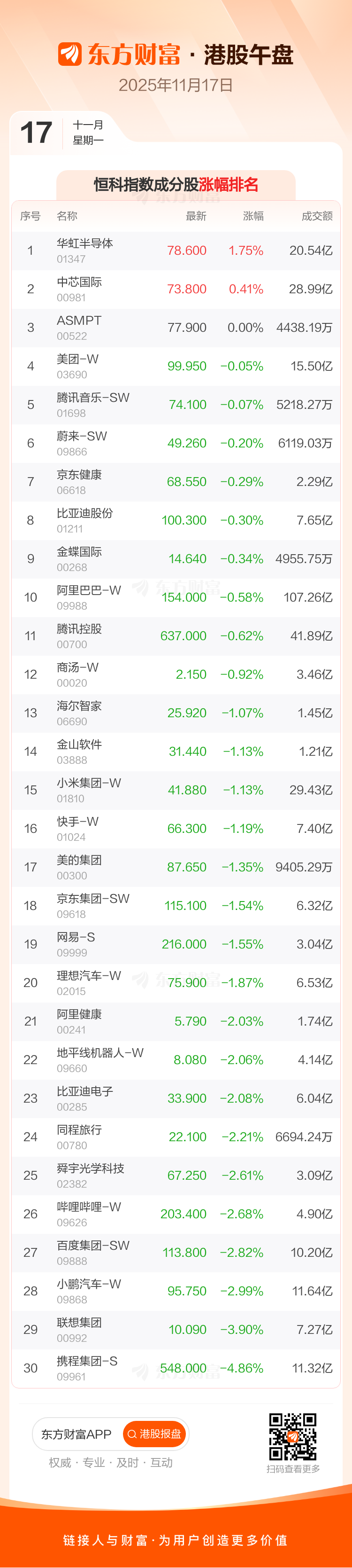 11月17日港股午盘:恒指跌0.8% 携程集团-S领跌成分股