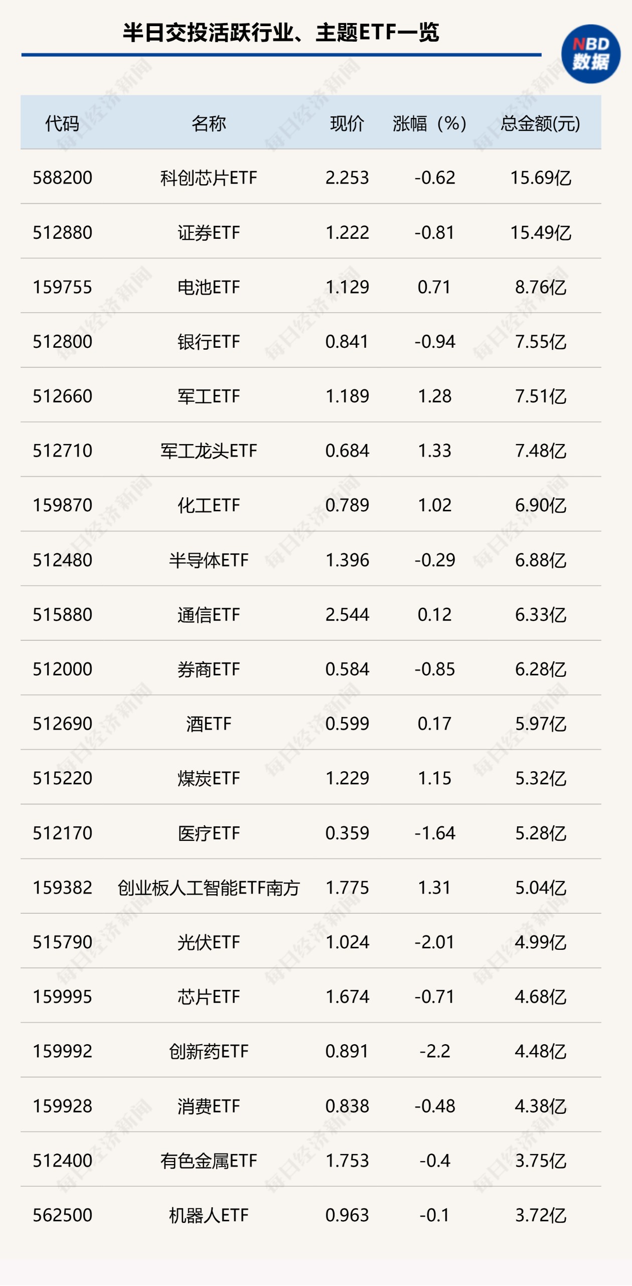 今日上午,跨境类ETF交投降温,无一只ETF半日成交金额超过50亿元,缩量明显。行业、主题ETF方面,科创芯片ETF(588200)和证券ETF(512800)半日成交金额超15亿元,交投相对活跃。