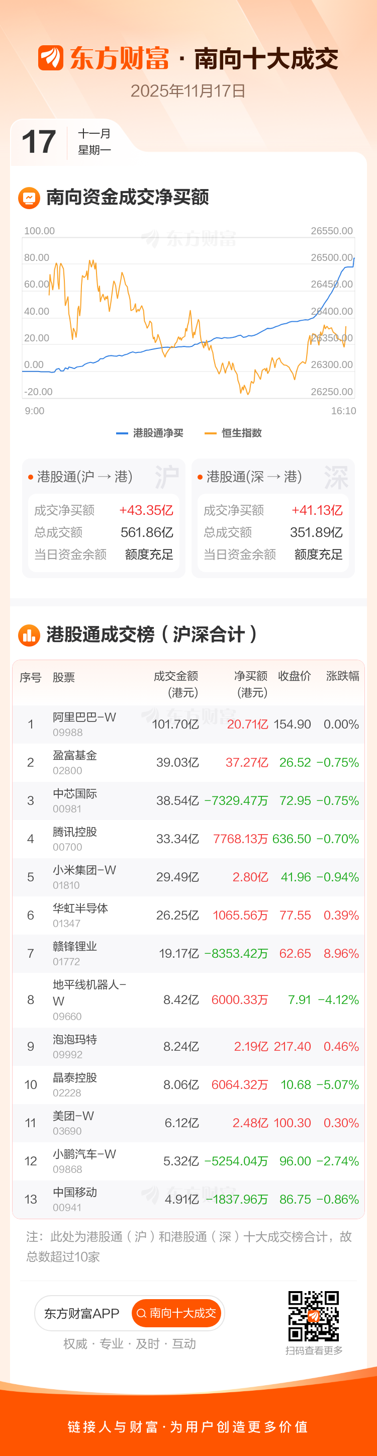 11月17日南向资金净买逾84亿港元,逾37亿抢筹盈富基金