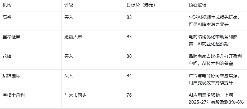 总体来看,尽管目标价存在分歧,但多数机构对快手维持“买入”或“跑赢大市”的乐观评级,其看涨逻辑普遍集中于电商结构优化带来的盈利提升、可灵AI的商业化潜力以及广告与电商的协同增长价值。
