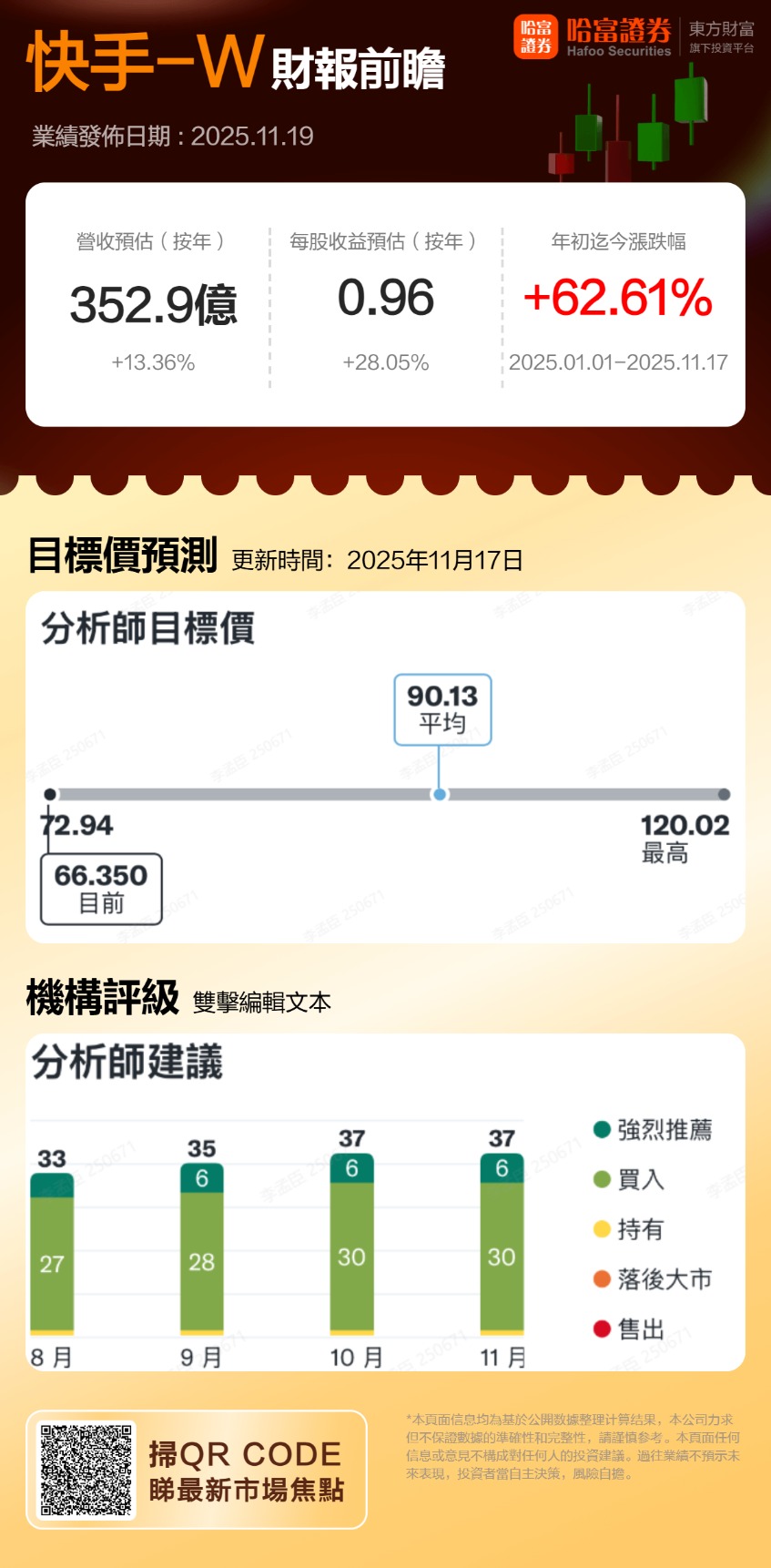 快手-W将于北京时间11月19日发布财报,2025Q3预计实现营收352.9亿元,同比增加13.36%;预期每股收益0.96元,同比增加28.05%。