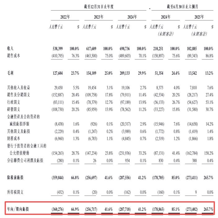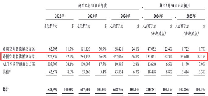 按业务类型划分,2022年、2023年、2024年和2025年上半年(以下简称“报告期内”),智慧互通的收入主要来自路侧空间智能解决方案,其营收占比分别为42.2%、46%、66.8%和87.1%,呈不断上升趋势。同期,AIoT空间智能解决方案营收占比从38.1%降至了7.9%。