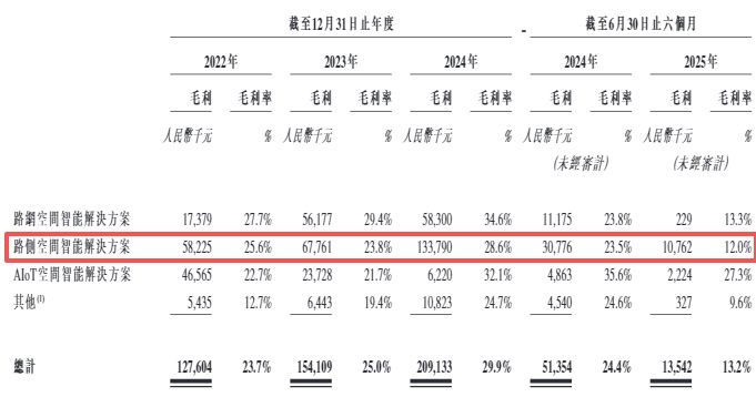 记者注意到,营收占比最高的路侧空间智能解决方案并非智慧互通报告期内毛利率最高的业务,该项业务毛利率分别为25.6%、23.8%、28.6%和12%,报告期内累计降幅达13.6个百分点。同期,AIoT空间智能解决方案毛利率从22.7%升至27.3%。