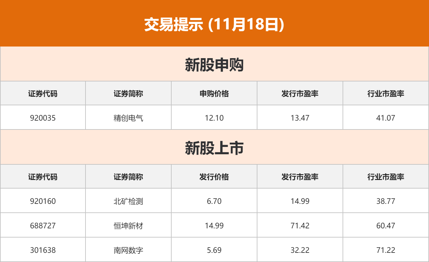 平潭发展公告称,公司股票自2025年10月17日至11月17日价格涨幅达255.19%,公司股票短期内价格涨幅较大,已严重背离公司基本面。公司将对股票交易波动情况进行核查,股票自11月18日开市起停牌。此外海峡创新公告称,公司股票自10月27日至11月17日价格涨幅为185.89%,为维护投资者利益,公司将就股票交易波动情况进行核查。经公司申请,公司股票自11月18日开市起停牌。