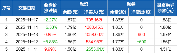 融资方面,当日融资买入7092.3万元,融资偿还6297.14万元,融资净买入795.16万元,连续4日净买入累计3668.56万元。融券方面,融券卖出0股,融券偿还0股,融券余量1.86万股,融券余额38.45万元。融资融券余额合计1.88亿元。