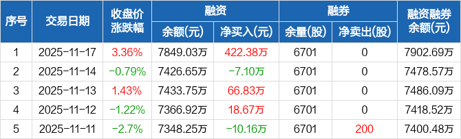 融资方面,当日融资买入1097.02万元,融资偿还674.64万元,融资净买入422.38万元。融券方面,融券卖出0股,融券偿还0股,融券余量6701股,融券余额53.66万元。融资融券余额合计7902.69万元。