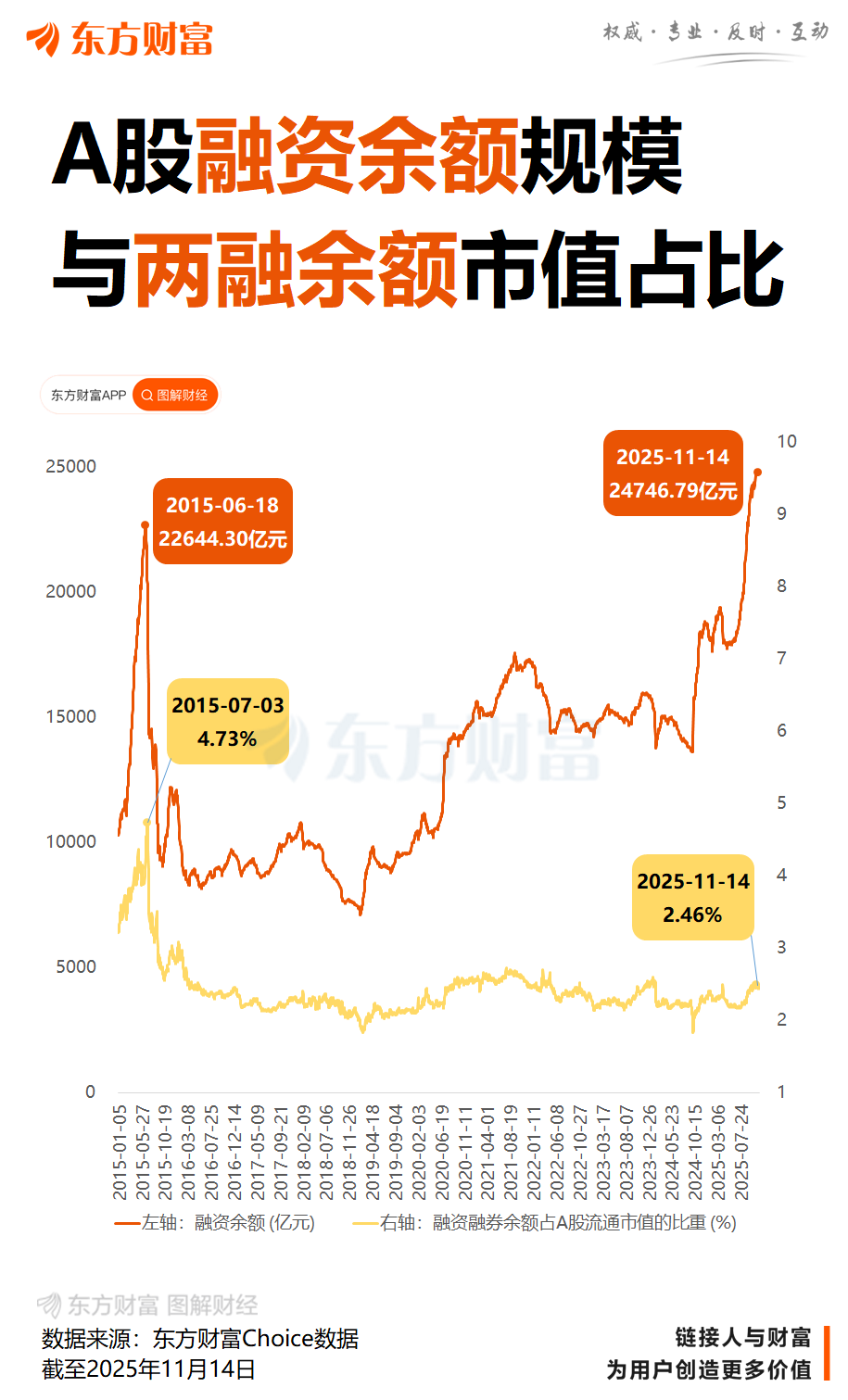 数据显示,下半年以来(7月1日以来,下同),A股融资余额不断攀升,10月29日创下历史新高24885.78亿元。融资余额最新值为24746.99亿元(截至11月14日),处于近15年高位。相较上半年末的18381.49亿元增长6365.5亿元,增幅34.63%。