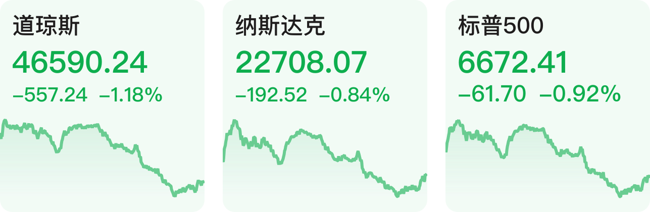 美股三大指数17日集体收跌,道指跌1.18%,纳指跌0.84%,标普500指数跌0.92%。大型科技股多数下跌,AMD、英特尔跌超2%,英伟达、苹果、甲骨文、Meta跌超1%,谷歌逆市涨超3%。热门中概股多数下跌,纳斯达克中国金龙指数收跌1.21%,小鹏汽车跌超10%,理想汽车跌超4%,网易、百度、蔚来跌超1%。